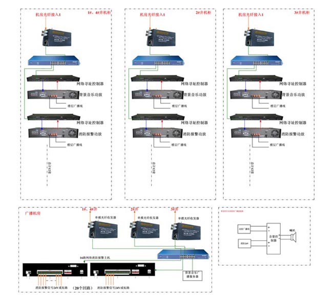 泰州碧桂園五星級大酒店位于江蘇省泰州市海陵區(qū)泰東河大橋北側(cè),地處生態(tài)旅游區(qū)。本次廣播設(shè)計安裝全金屬音箱1265只,按照功能分為40個區(qū)域,每個區(qū)域同時播放不同背景音樂;設(shè)置中心主控機(jī)房一個,分中心機(jī)房4個;廣播系統(tǒng)與酒店消防報警系統(tǒng)聯(lián)動實(shí)現(xiàn)N-3、N-2、N-1、N、N+1、N+2、N+3報警。